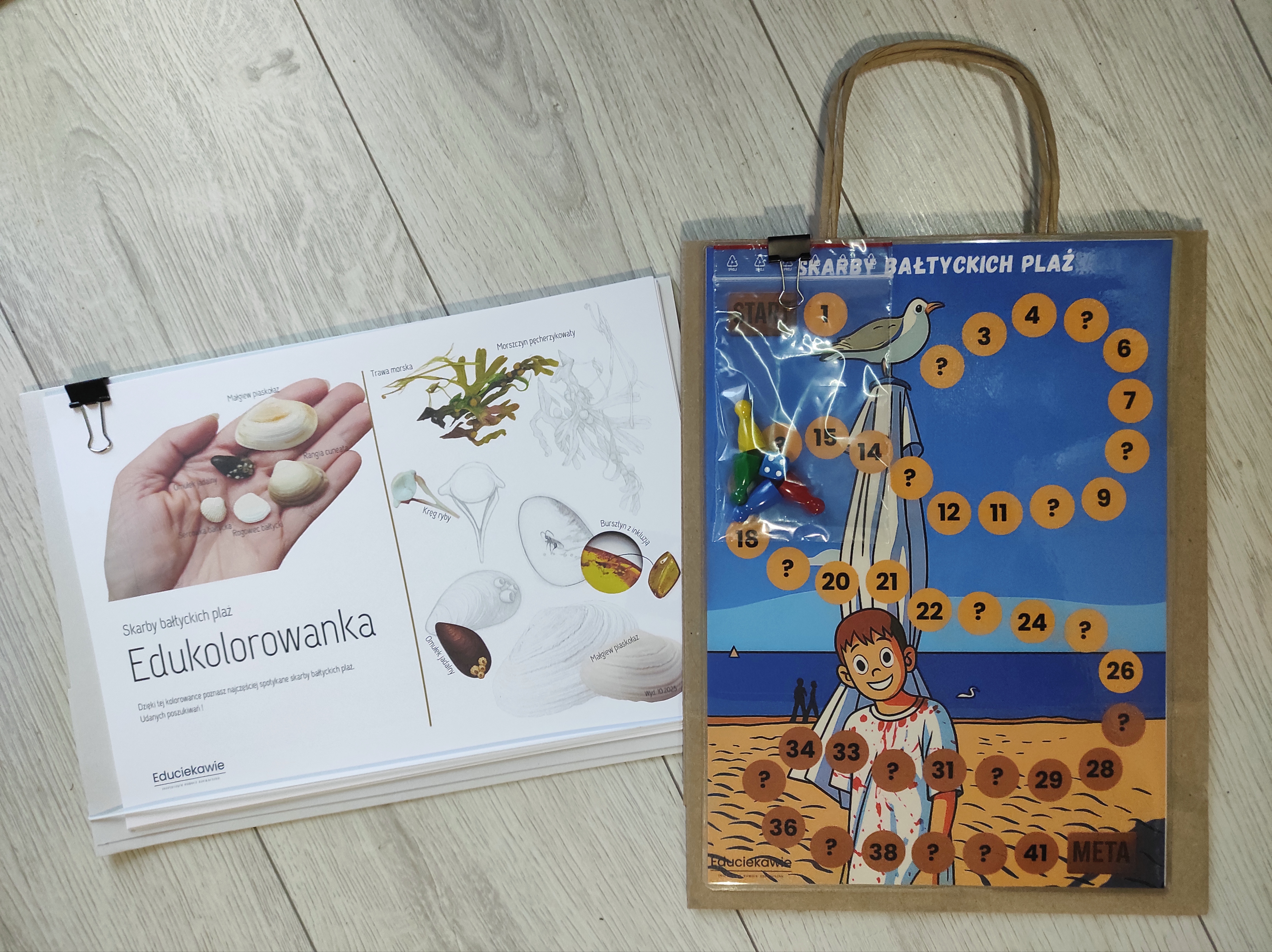 Kolorowanka edukacyjna zawiera karty z najczęściej spotykanymi „skarbami” bałtyckich plaż np. muszle małży, kraby, ptaki, foki, trawa morska, morszczyn pęcherzykowaty czy skamieniałości z ciekawostkami, kodami QR.